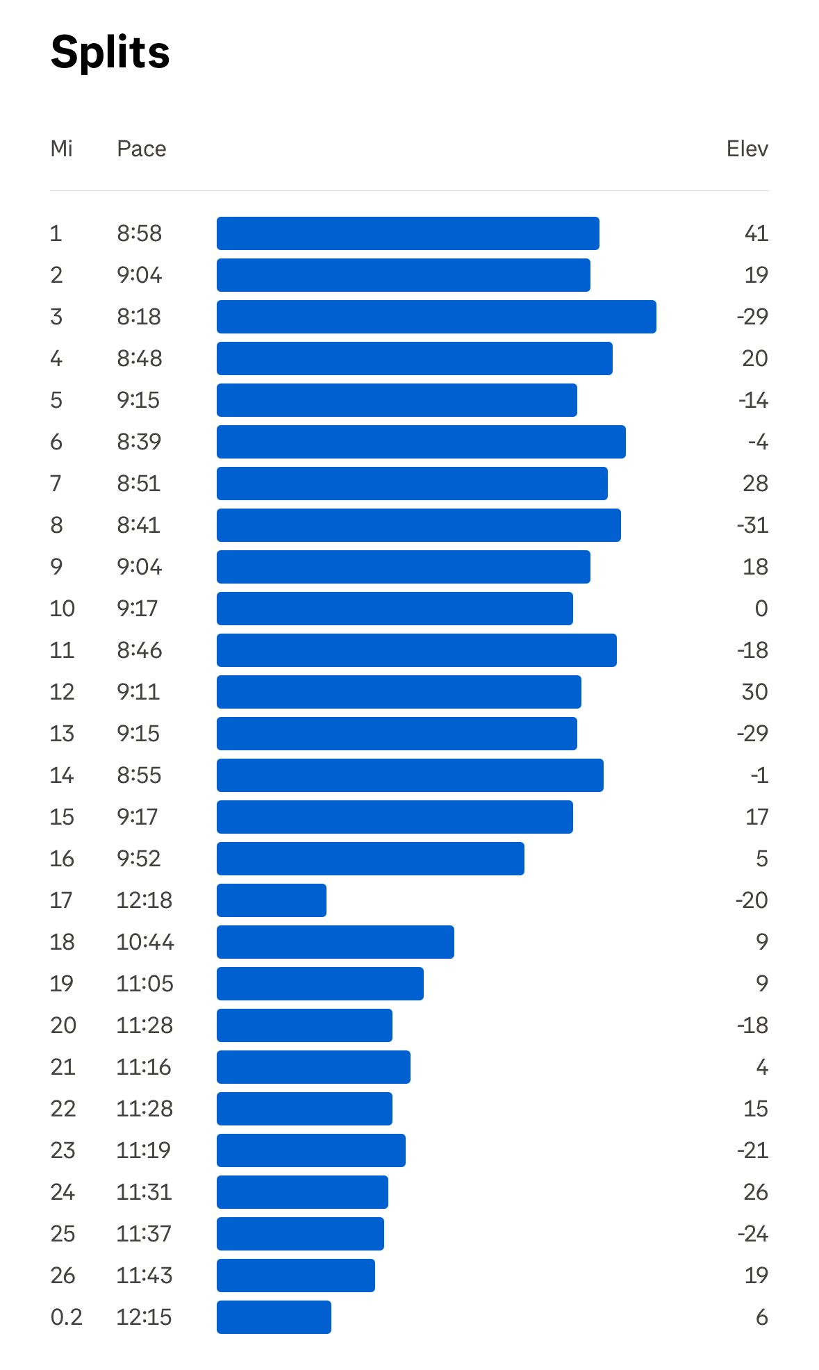 Around 16/17 miles, my knees really started flaring up. It was the only point in the run that I genuinely thought I might not make it. I wasn’t willing to seriously injure myself for this. That’s when I began to “shuffle”. It shifted the burden from my knees to my calves and I realised I could keep going. It was an amazing moment of remembering there’s always a way. I didn’t have to quit; I just needed to adjust my strategy. And it worked. The downside is that it slowed me down massively. You can see in the splits how my mile time fell off a cliff.