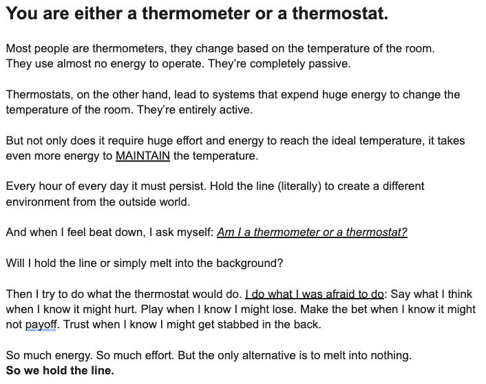 This is one of the best and most original perspectives on achieving victory I’ve ever read. Accepting defeat doesn’t mean resigning yourself to failure. Accepting the possibility of defeat is about freeing up your mind to focus 100% on achieving victory. Read the full piece here. (It’s worth it)